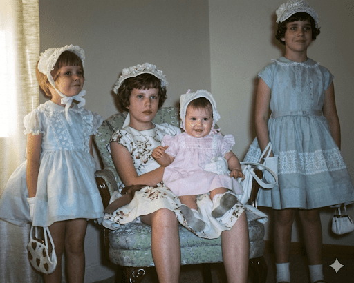 Four girls in Easter dresses. Three little ones and an older sister. Bonnets. White gloves. Small purses. Careful posture. They are cute.